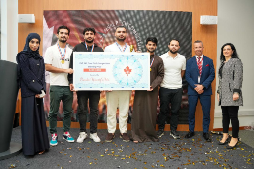 كما شهدت مسابقة العرض النهائي لمقرر ريادة الأعمال تقديم فرق مختارة لأفكار مبتكرة تم تطويرها على مدار أسابيع من التعلم التطبيقي، حيث فاز فريق إيه آر روبوت بجائزة إضافية بقيمة 3,000 درهم إماراتي، تقديرًا لإبداعه وجدوى مشروعه وما يحمله من وعد ريادي