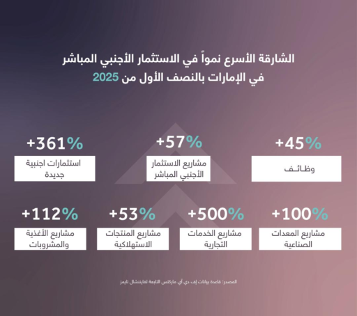 كشف مكتب الشارقة للاستثمار الأجنبي المباشر (استثمر في الشارقة) أن الإمارة تصدرت قائمة الإمارات الأسرع نمواً في استقطاب تدفقات الاستثمار الأجنبي المباشر خلال النصف الأول من عام 2025، حيث أظهرت نمواً بنسبة 57% في عدد المشاريع، و 361% في حجم الاستثمارات الرأسمالية، و45% في فرص العمل مقارنة بالفترة نفسها من عام 2024، ما يعكس تسارع وتيرة النمو الاقتصادي، ويؤكد نجاح الشارقة في تعزيز قدرتها التنافسية على استقطاب الاستثمارات النوعية.