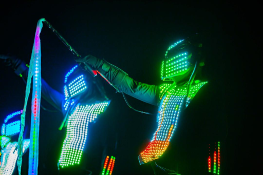 وارتدى أعضاء الفرقة الأربعة بدلات مزودة بشرائط LED مدمجة في الخوذة والصدر والأطراف، وتتحكم بها أنظمة لاسلكية تتيح تبديل الألوان والإضاءة بما يتوافق مع الموسيقى الحية أثناء الأداء. وقدم الراقصون فقرات تتراوح بين الرقص الإيقاعي واستخدام العصيّ المضيئة والأشرطة العاكسة في تشكيلات جماعية تجسّد انسجام الضوء مع الحركة.