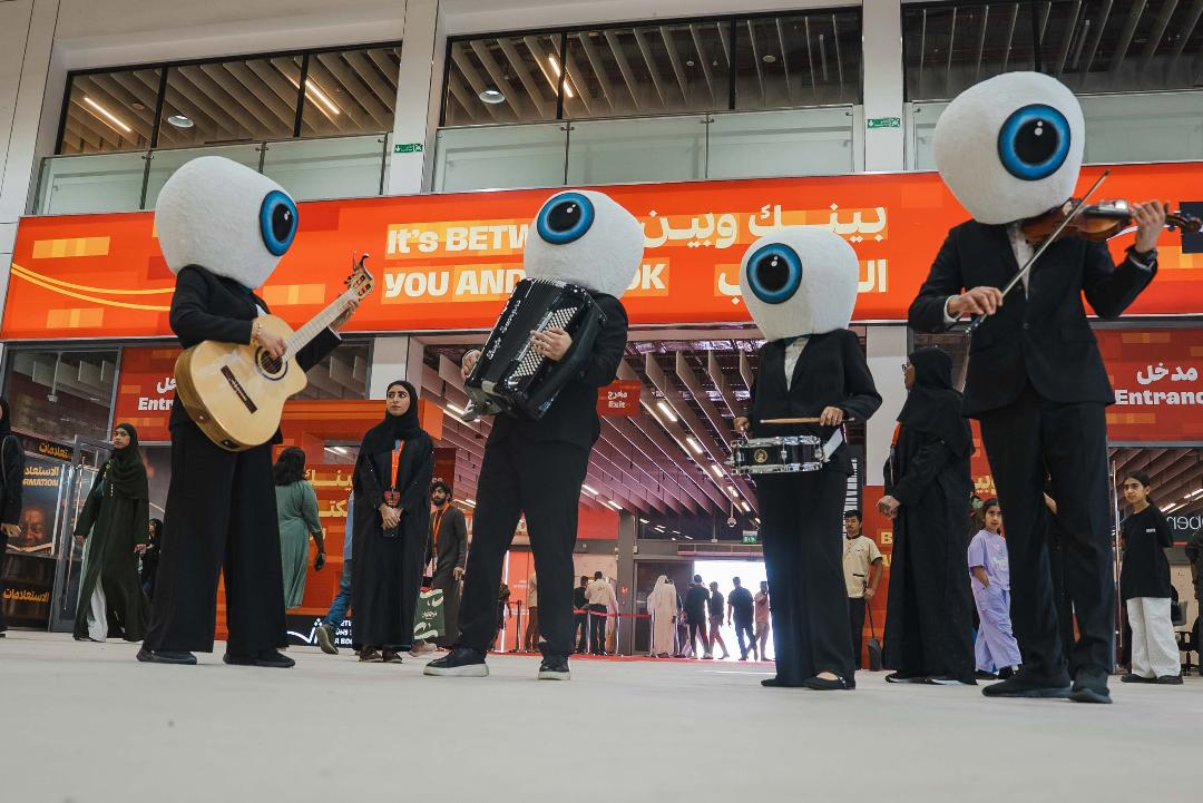تكوّنت الفرقة من أربعة عازفين ارتدوا أزياء سوداء أنيقة، تعلو رؤوسهم مجسّمات ضخمة على هيئة عيون بشرية متحرّكة، في مشهد بصريّ جمع بين الغرابة والجمال، وجذب أنظار الزوّار منذ اللحظة الأولى. قدّم العازفون مزيجاً متناغماً من الإيقاعات والمعزوفات القصيرة على آلات الغيتار والأكورديون والكمان والطبلة، فامتزج اللحن بالحركة، وتحولت الممرات إلى فضاء موسيقي مفتوح يتنقّل فيه الجمهور مع العرض أينما ذهب.