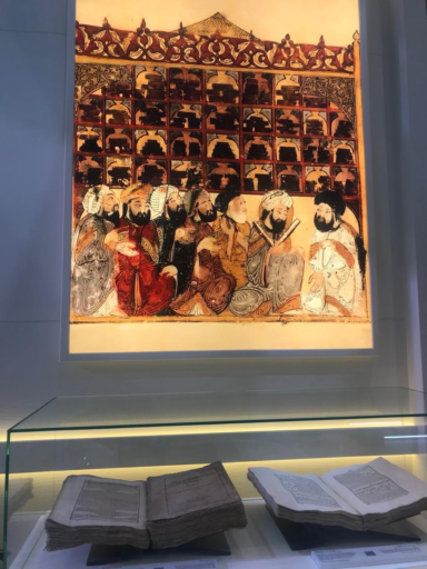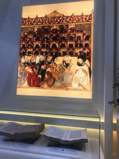 أما القسم الثاني من الجناح، فكان بمثابة معرضٍ فني صغير، حيث عُرضت لوحة نادرة للفنان يحيى بن محمود الواسطي مأخوذة من كتاب مقامات الحريري (1237م). بدت اللوحة كأنها نافذة مفتوحة على عالمٍ عربيّ يفيض بالحياة، تحكي عن جماليات الفن العربي في زمنٍ كان القلم فيه رفيق الريشة، وكانت الحروف جسراً بين الإبداع والتأمل.