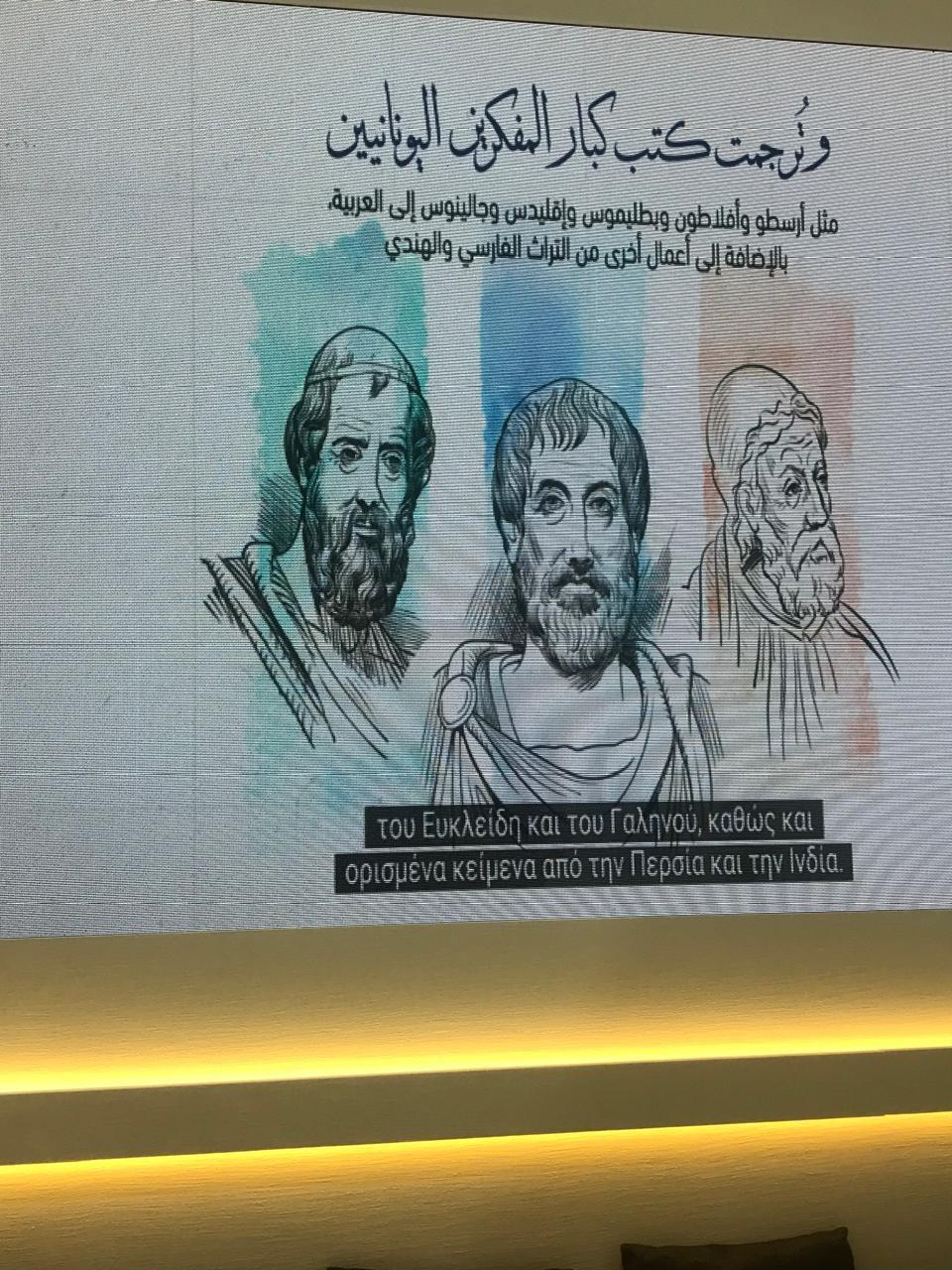 هناك بين الضوء الهادىء والألوان المستوحاة من المخطوطات القديمة، تبدأ الرحلة بعرضٍ مرئيّ يستحضر قصة انتقال العلوم اليونانية إلى العربية. في هذا الركن تتجسّد مشاهد المترجمين في بيت الحكمة العباسي، أولئك الذين جمعوا بين دقة الحساب وبهاء اللغة، فحوّلوا المعرفة إلى جسر يصل بين أثينا وبغداد، وبين الفلسفة والعلم والدين.