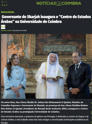 حظي افتتاح صاحب السمو الشيخ الدكتور سلطان بن محمد القاسمي، عضو المجلس الأعلى حاكم الشارقة، لمركز الدراسات العربية في جامعة كويمبرا البرتغالية، وإطلاقه المنصة الرقمية لمكتبة “جوانينا” التاريخية، بتغطية واسعة من كبرى الصحف البرتغالية والعربية والعالمية، التي احتفت بمبادرات صاحب السمو حاكم الشارقة، ووصفتها بأنها تمثل مرحلة جديدة من الحوار الأكاديمي والثقافي بين العالمين العربي والأوروبي.