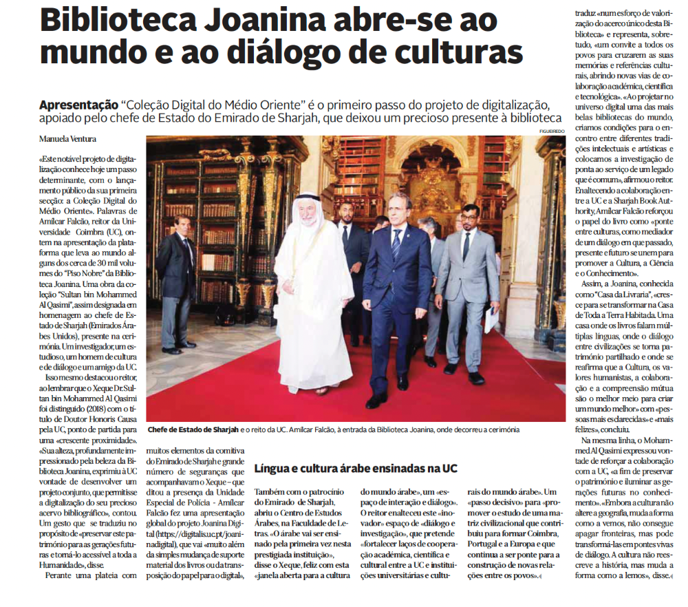 وفي تقرير موسّع نشرته صحيفة “دياريو آش بييراس” أبرزت الصحيفة الدور الريادي لحاكم الشارقة في دعم مشروع رقمنة مكتبة جوانينا، الذي يتيح للباحثين والجمهور الاطلاع على أكثر من 30 ألف كتاب ومخطوطة نادرة، مشيرة إلى أن المشروع يأتي ثمرة شراكة بين جامعة كويمبرا وهيئة الشارقة للكتاب ويمتد لسبع سنوات.