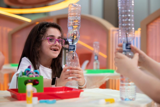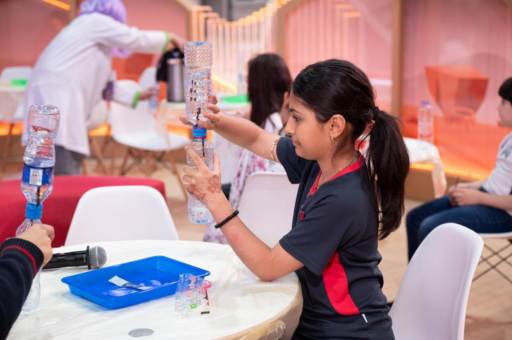 وتعلم الأطفال المشاركون في الورشة كيفية تصميم وصناعة ساعة مائية باستخدام مواد معادة التدوير، وتعرفوا على مبدأ قياس الوقت من خلال تدفق المياه، حيث قاموا بإلصاق أغطية عبوات المياه البلاستيكية الفارغة فوق بعضها، بعد تثبيت أنابيب قصيرة تضمن تدفق المياه من العبوة العلوية إلى السفلى.