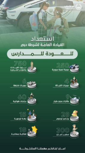 أعلنت القيادة العامة لشرطة دبي ممثلة بمبادرة “أمن المدارس”، اكتمال خطتها لعودة الطلبة إلى مقاعدهم الدراسية للعام الدراسي الجديد 2025-2026، متمنيةً للطلبة وأعضاء الهيئات التدريسية والإدارية والفنية وأولياء الأمور عاماً دراسياً مليئاً بالنجاح والتميز.