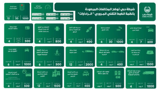 وقدمت الإدارة العامة للمرور شرحاً حول المخالفات المرورية التي تضبطها أنظمة الضبط التقني المروري، ومنها مخالفة تجاوز الحد الأقصى للسرعة، حيث تبلغ غرامة تجاوز الحد الأقصى للسرعة بما يزيد عن 80 كم/ ساعة، مبلغ 3 آلاف درهم، وحجز المركبة لمدة 60 يوماً، وتسجيل 23 نقطة سوداء للسائق، فيما تبلغ الغرامة المالية لتجاوز السرعة المحددة بما يزيد عن 60 كم/ساعة، قيمة 2000 درهم وحجز المركبة لمدة 20 يوماً، و12 نقطة سوداء، في حين تبلغ قيمة الغرامة المالية بما يزيد عن السرعة المحددة بـ 50 كم/ساعة، مبلغ 1000 درهم، وأما تجاوز السرعة بما يزيد عن 40 كم/ ساعة، 700 درهم، وتجاوز السرعة عن 30 كم/ ساعة، مبلغ 600 درهم، وما يزيد عن 20 كم/ ساعة، 300 درهم.