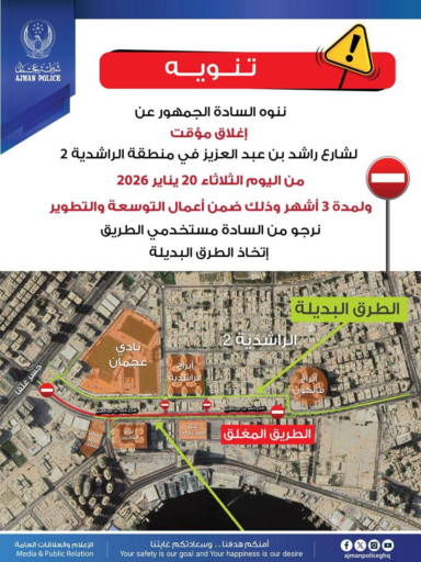 تعلق القيادة العامة لشرطة عجمان عن إغلاقٍ مؤقت لشارع راشد بن عبد العزيز في منطقة الراشدية (2)، وذلك ضمن أعمال التوسعة والتطوير، بالتعاون مع دائرة البلدية والتخطيط، اعتباراً من 20 يناير 2026 ولمدة ثلاثة أشهر، ويشمل المقطع الممتد من أبراج فالكون وحتى تقاطع جسر غلفا.
