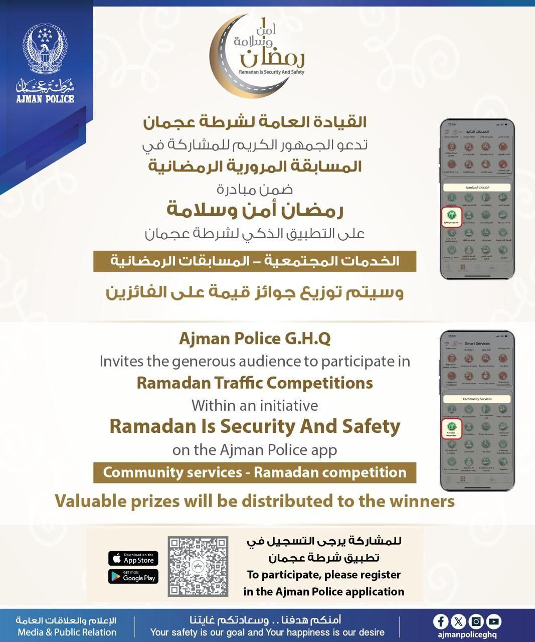 دعت القيادة العامة لشرطة عجمان القيادة العامة لشرطة عجمان الجمهور الكريم للمشاركة في المسابقة المرورية الرمضانية على التطبيق الذكي لشرطة عجمان، الخدمات المجتمعية – المسابقات الرمضانية