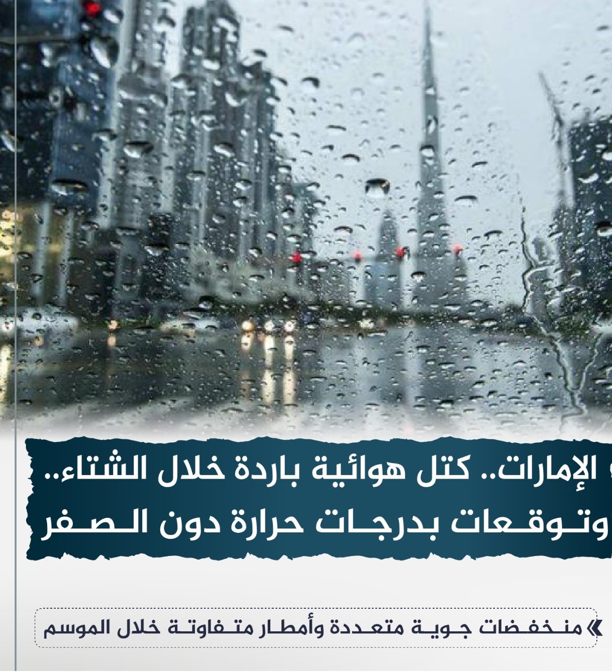ذكر المركز الوطني للأرصاد أن فصل الشتاء يبدأ فلكياً في النصف الشمالي من الكرة الأرضية في الثلث الأخير من شهر ديسمبر، وتحديداً في 22 ديسمبر، ويُعد المرتفع الجوي السيبيري هو النظام الجوي السائد خلال فترة الشتاء في الطبقة السطحية، حيث يمتد إلى منطقة الخليج العربي، وتصاحبه رياح شمالية غربية تكون نشطة أحياناً، أو رياح شمالية شرقية، مما يؤدي إلى تدفق كتلة هوائية باردة تتسبب في انخفاض ملحوظ في درجات الحرارة على الدولة خلال هذا الفصل، خاصة في ساعات الليل والصباح الباكر.