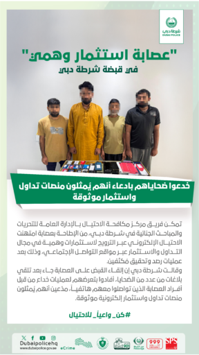 تمكن فريق مركز مكافحة الاحتيال بالإدارة العامة للتحريات والمباحث الجنائية في شرطة دبي، من الإطاحة بعصابة امتهنت الاحتيال الإلكتروني عبر الترويج لاستثمارات وهمية في مجال التداول والاستثمار عبر مواقع التواصل الاجتماعي، وذلك بعد عمليات رصد وتحقيق مُكثفين.