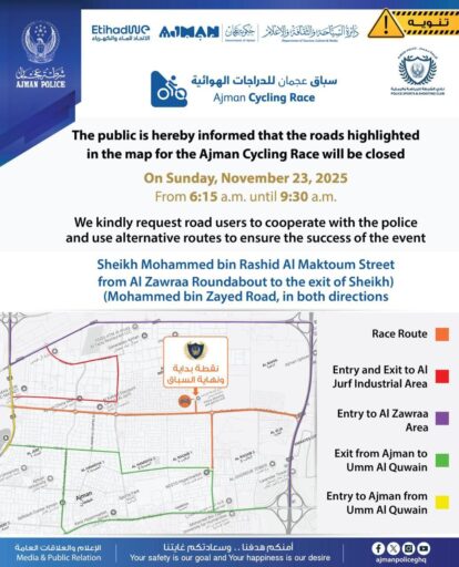 شرطة عجمان تعلن عن إغلاق شارع محمد بن راشد آل مكتوم باتجاه دوار الزوراء حتى مخرج طريق شارع محمد بن زايد بالاتجاهين يوم الأحد الموافق 23 نوفمبر الجاري من الساعة السادسة والربع صباحا لغاية الساعة 9 ونصف صباحا منوهة للجمهور اتخاذ مسارات الطرق البديلة لتسهيل الحركة المرورية خلال مسار سباق الدراجات الهوائية