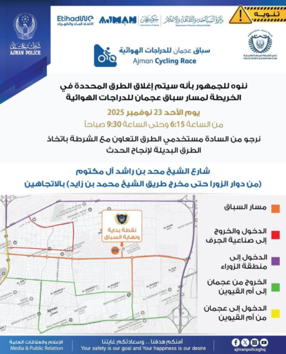 شرطة عجمان تعلن عن إغلاق شارع محمد بن راشد آل مكتوم باتجاه دوار الزوراء حتى مخرج طريق شارع محمد بن زايد بالاتجاهين يوم الأحد الموافق 23 نوفمبر الجاري من الساعة السادسة والربع صباحا لغاية الساعة 9 ونصف صباحا منوهة للجمهور اتخاذ مسارات الطرق البديلة لتسهيل الحركة المرورية خلال مسار سباق الدراجات الهوائية